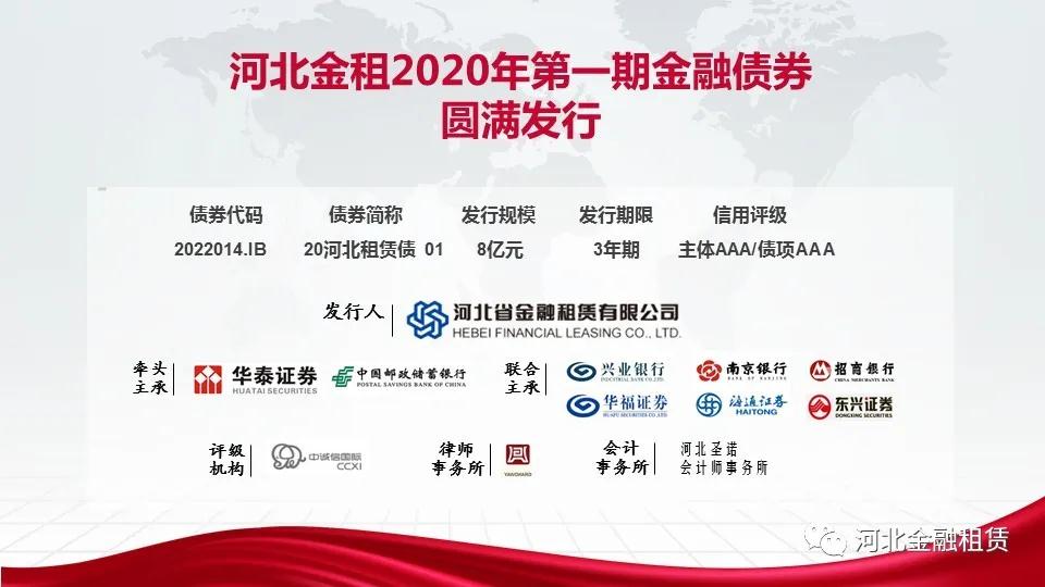 日前,河北省金融租賃有限公司(以下簡稱“河北金租”)2020年第一期金融債券成功發(fā)行,發(fā)行規(guī)模8億元,期限3年。此次河北金租發(fā)行的金融債券場內(nèi)認(rèn)購倍數(shù)達(dá)到2倍,投資人認(rèn)可度較高,債券所募資金將主要用于清潔能源、節(jié)能環(huán)保、醫(yī)療健康等公司戰(zhàn)略行業(yè)項目投放,同時積極助力新冠肺炎防控,為防疫醫(yī)療設(shè)備商和服務(wù)商、新冠疫情定點醫(yī)療機(jī)構(gòu)提供金融服務(wù),支持湖北等地區(qū)公共事業(yè)及工程裝備制造等行業(yè)發(fā)展。
